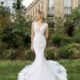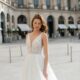 Une magnifique robe de mariage ultra fluide en mousseline avec une large manche à volant. Col en V plongeant cintré à la taille par une jolie ceinture.